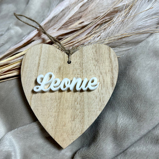 Ornement personnalisé en bois à suspendre au sapin en forme de cœur avec prénom en couleurs au choix