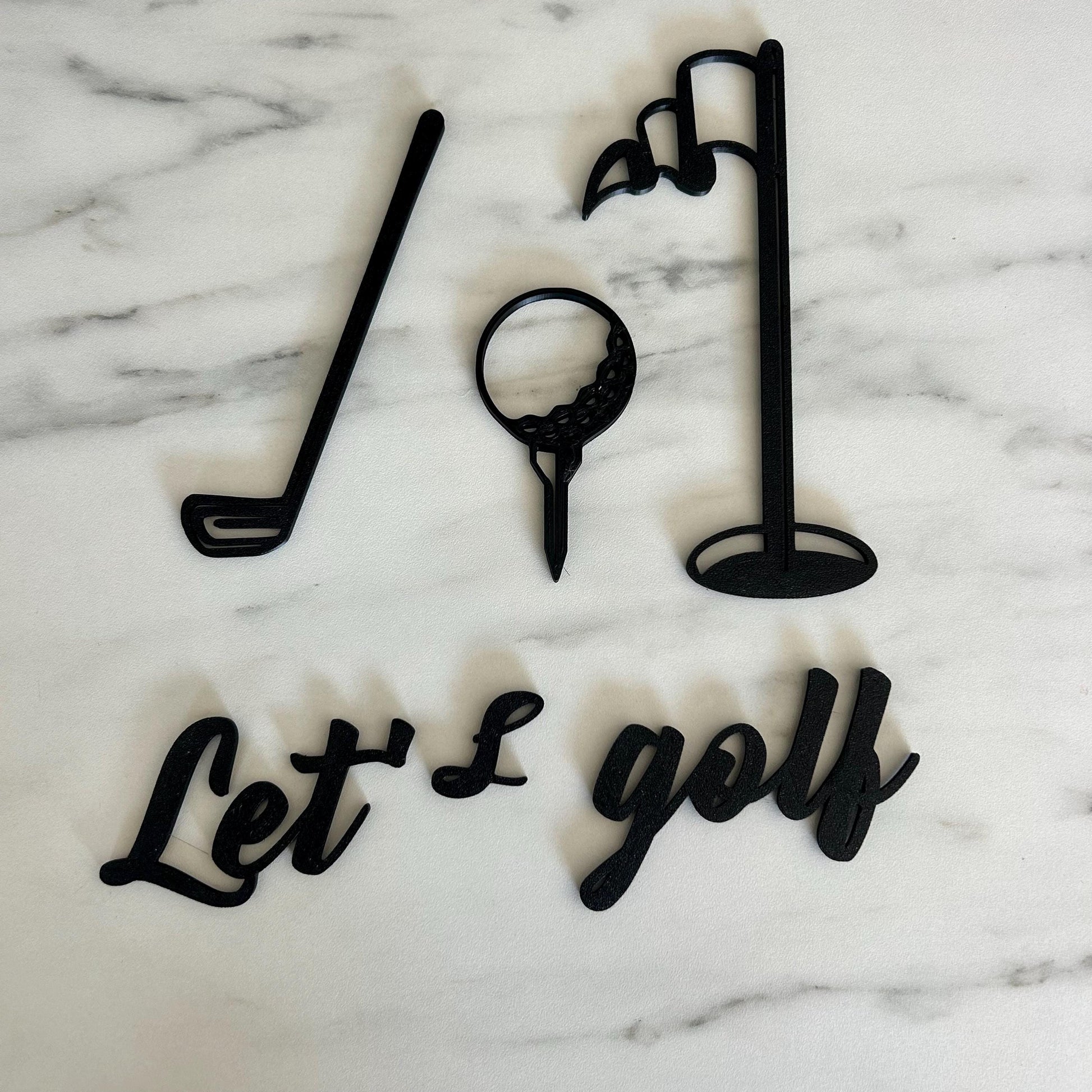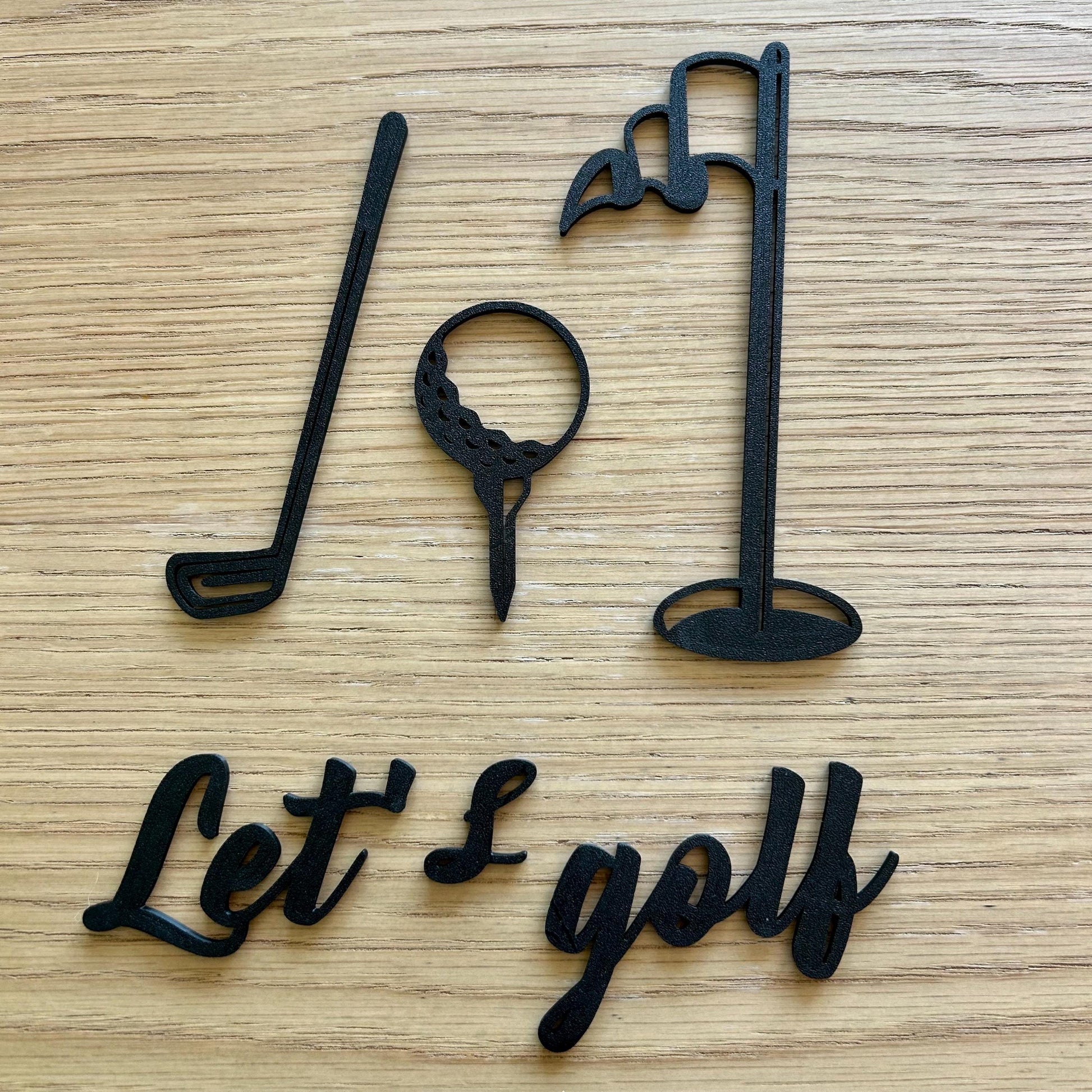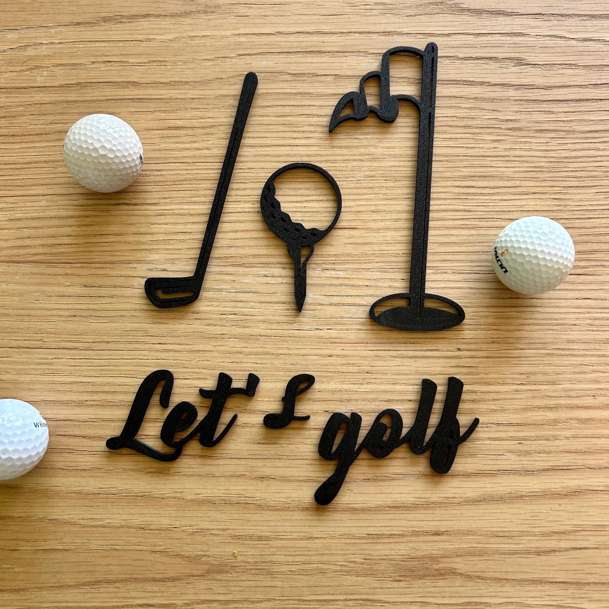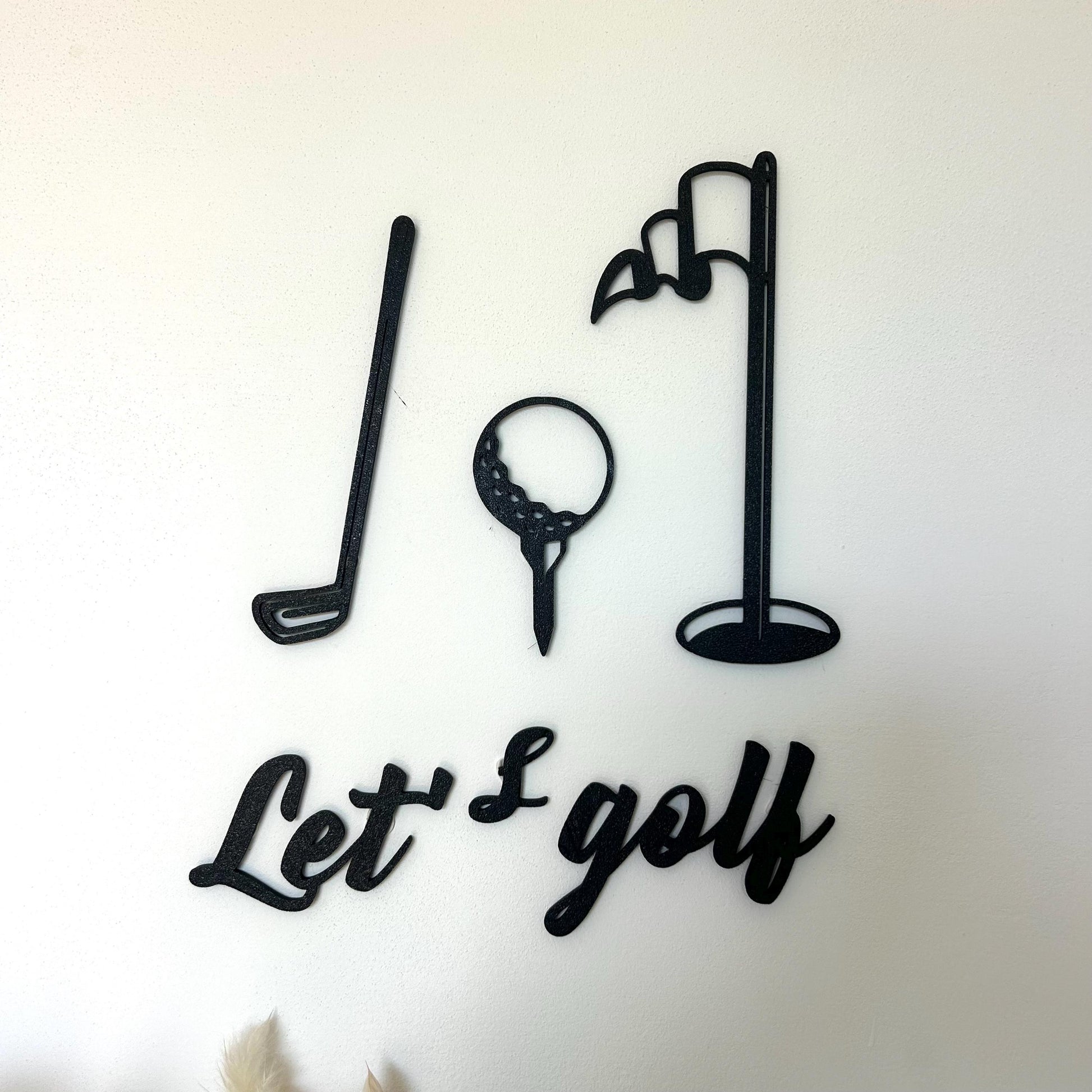 Ce set mural en métal noir représente les éléments iconiques du golf : un club, une balle sur un tee, un drapeau et l’inscription stylisée “Let’s golf”. Un design épuré, minimaliste et élégant qui s’intègre parfaitement dans un bureau, un salon, un coin sport ou même un clubhouse.